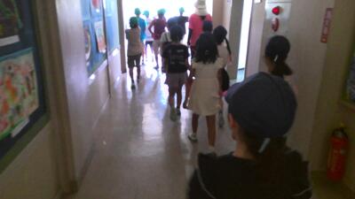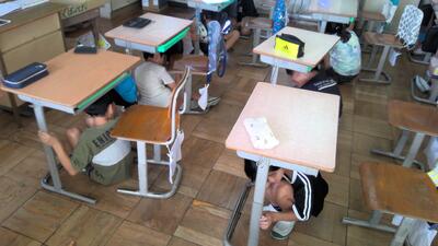 地震発生後に、校舎内から火災が発生するという設定で避難訓練が行われました。児童は、教師の指示のもと、机の下に速やかにもぐったり、列を作り静かに校庭へと避難したりするなど、落ち着いて地震と火災の避難行動がとれていました。真剣に訓練に臨む姿も素晴らしかったです。