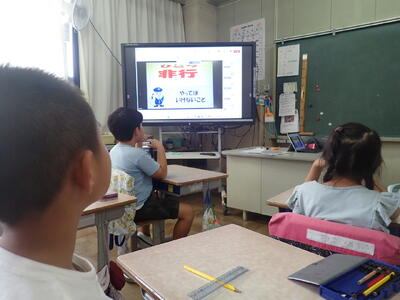 埼玉県警察非行防止指導班「あおぞら」の方に来校いただき、非行防止教室が行われました。下学年と上学年を対象に、学校や家庭でのトラブルや犯罪の防止、思いやりの大切さなどについて、映像資料をもとにわかりやすく講義していただきました。