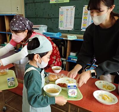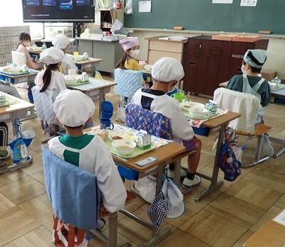 いよいよ1年生も、給食が始まりました。若干緊張気味に配膳を進め、みんなでそろって「いただきます」。今日のメニューは、ツイストパンにオニオンスープ、ハンバーグもコーンポテトもおいしくいただきました。